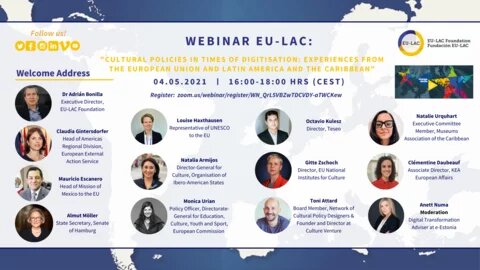 This webinar aimed to provide a space for dialogue and presentation of challenges and promising initiatives at the level of cultural policies in Latin America and the Caribbean and the European Union. It contributed to the generation of knowledge and the bi-regional exchange of information about opportunities, initiatives and best practices in terms of digitisation in the field of culture at national, sub-regional and bi-regional levels.